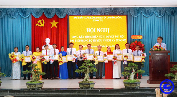 Dịp này, Huyện ủy Gò Công Đông tặng giấy khen cho 09 tập thể và 10 cá nhân có thành tích hoàn thành xuất sắc nhiệm vụ trong việc thực hiện Nghị quyết Đại hội Đảng bộ huyện lần thứ XII, nhiệm kỳ 2020 - 2025.